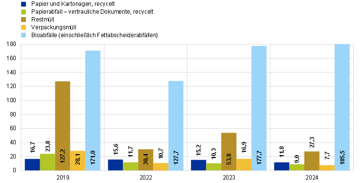 Anmerkung: Weitere Informationen zu diesen Entwicklungen finden sich in Kapitel 6 – Umweltaspekte und -auswirkungen der EZB-Aktivitäten. Einzelheiten zu den Umweltdaten pro Arbeitsplatz im Jahr 2024 sind Kapitel 7 – Technische Informationen zu entnehmen.