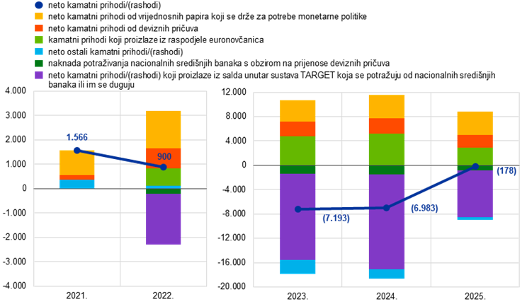 Bilanca ESB‑a smanjila se u 2025. za 37,3 mlrd. EUR, uglavnom zbog smanjenja vrijednosnih papira koji se drže za potrebe monetarne politike, do kojeg je došlo jer je Eurosustav prestao reinvestirati glavnice dospjelih vrijednosnih papira u sklopu APP‑a i PEPP‑a. | ESB‑ov gubitak u 2025. bio je znatno manji nego u 2024., u prvom redu zbog smanjenja kamatnih rashoda od neto obveze u sustavu TARGET.