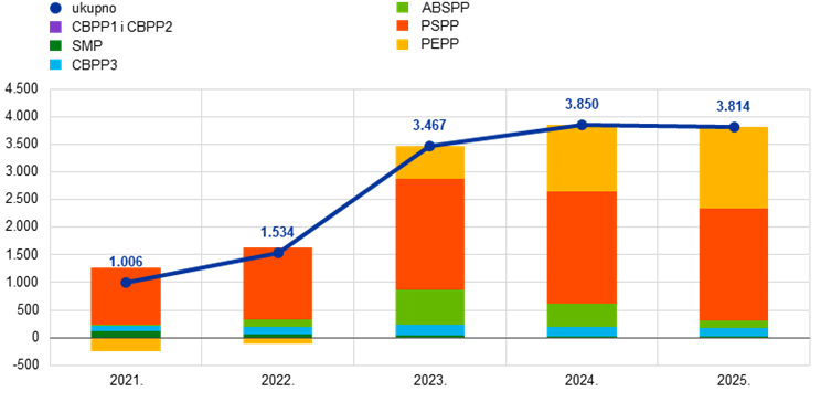 Na temelju odgovarajućih odluka Upravnog vijeća Eurosustav je prestao reinvestirati glavnice dospjelih vrijednosnih papira u sklopu APP‑a od srpnja 2023. i u sklopu PEPP‑a na kraju 2024. Zbog tih su se odluka vrijednosni papiri koje ESB drži za potrebe monetarne politike smanjivali umjerenom i predvidljivom dinamikom. Portfelji koji se drže za potrebe monetarne politike ukupno su se u 2025. smanjili za 51,5 mlrd. EUR na 325,3 mlrd. EUR (Grafikon 2.). Portfelj APP‑a smanjio se za 33,7 mlrd. EUR na 186,5 mlrd. EUR, i to za 26,5 mlrd. EUR u sklopu PSPP‑a, za 4,0 mlrd. EUR u sklopu ABSPP‑a i za 3,1 mlrd. EUR u sklopu trećeg CBPP‑a. Portfelj PEPP‑a smanjio se za 17,8 mlrd. EUR na 138,6 mlrd. EUR.