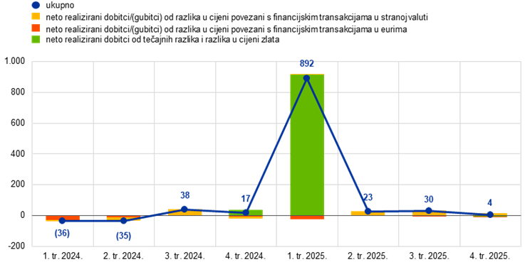 Ukupna eurska protuvrijednost deviznih pričuva ESB‑a – koje se sastoje od zlata, posebnih prava vučenja, američkog dolara, japanskog jena i kineskog juana renminbija – povećala se u 2025. za 13,6 mlrd. EUR na 116,8 mlrd. EUR.