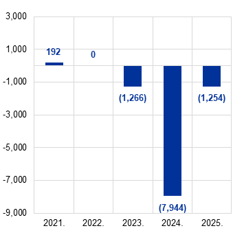 ESB‑ov gubitak za 2025. iznosio je 1.254 mil. EUR, dok je u 2024. iznosio 7.944 mil. EUR. Na osnovi odluke Upravnog vijeća taj će se gubitak prenijeti u bilanci ESB‑a te će se nadomjestiti budućom dobiti.