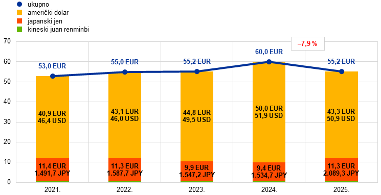 Devizna sredstva ESB‑a u američkim dolarima, japanskim jenima i kineskim juanima renminbijima, izražena u eurima, smanjila su se u 2025. za 4,8 mlrd. EUR na 55,2 mlrd. EUR (Grafikon 5.), uglavnom zbog deprecijacije američkog dolara i japanskog jena u odnosu na euro.[15] Zbog deprecijacije američkog dolara smanjila su se i salda na računima revalorizacije ESB‑a (vidi odjeljak 1.3.2. Neto kapital) a zbog deprecijacije japanskog jena došlo je do umanjenja zbog tečajnih razlika priznatog u računu dobiti i gubitka na kraju godine jer su povezani računi revalorizacije bili potpuno ispražnjeni u 2024. (vidi odjeljak 1.3.3. Račun dobiti i gubitka). Unatoč umanjenju držanja u japanskim jenima povećala su se zbog uobičajenog restrukturiranja radi usklađenja sastava deviznih pričuva ESB‑a s ciljnom raspodjelom. U sklopu restrukturiranja ESB je tijekom prvog tromjesečja 2025. prodao malen dio držanja u američkim dolarima i u potpunosti reinvestirao prihode u držanja u japanskim jenima.