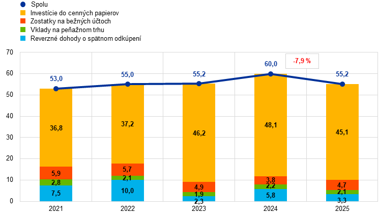 Poznámka: Od roku 2025 ECB uvádza jednodňové investície hotovostných zostatkov pod položkou „Reverzné dohody o spätnom odkúpení“, ak sú súčasťou súboru prostriedkov investovaných do dohôd o spätnom odkúpení. Súvisiace zostatky za roky 2021 – 2024 boli zodpovedajúcim spôsobom preradené z položky „Zostatky na bežných účtoch“ pod položku „Reverzné dohody o spätnom odkúpení“.