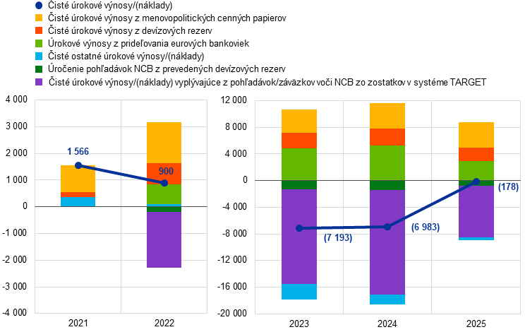 Vývoj záväzkov v rámci Eurosystému je daný predovšetkým vývojom čistého záväzku v systéme TARGET. Hlavnými faktormi zmien čistého záväzku v systéme TARGET v období od roku 2021 do roku 2025 boli nákupy a splácanie menovopolitických cenných papierov vyrovnávaných prostredníctvom účtov v systéme TARGET, ako aj zmeny záväzkov voči rezidentom a nerezidentom eurozóny v eurách (graf 10). Čistý záväzok ECB v rámci systému TARGET sa v roku 2025 znížil o 34,6 mld. €, najmä v dôsledku prílevu hotovosti zo splácania cenných papierov držaných na účely menovej politiky, ktorý bol čiastočne vyvážený odlevom hotovosti v dôsledku i) zníženia záväzkov voči nerezidentom eurozóny v eurách a ii) úrokových nákladov na čistý záväzok ECB v systéme TARGET.