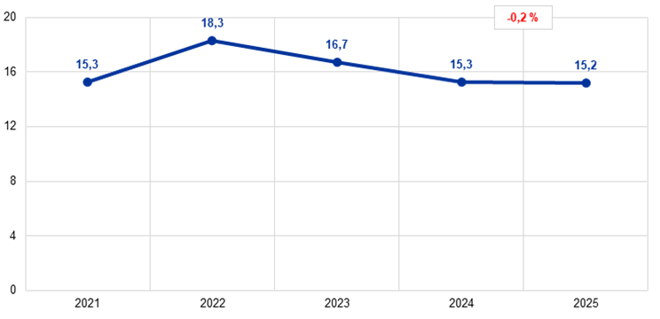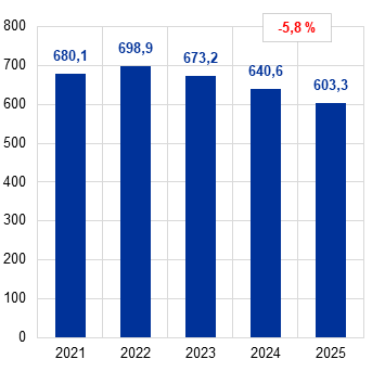 V roku 2025 redukcia súvahy ECB pokračovala, o 37,3 mld. € na 603,3 mld. €, opäť predovšetkým v dôsledku splácania cenných papierov v rámci programov APP a PEPP. Splácanie viedlo k zníženiu stavu cenných papierov držaných na účely menovej politiky, zatiaľ čo peňažné vyrovnanie týchto transakcií prostredníctvom účtov v systéme TARGET viedlo k zodpovedajúcemu poklesu záväzkov v rámci Eurosystému. Tento pokles bol len čiastočne kompenzovaný odlevom hotovosti v dôsledku nižších vkladov v ECB, čo zároveň viedlo k zníženiu ostatných záväzkov.