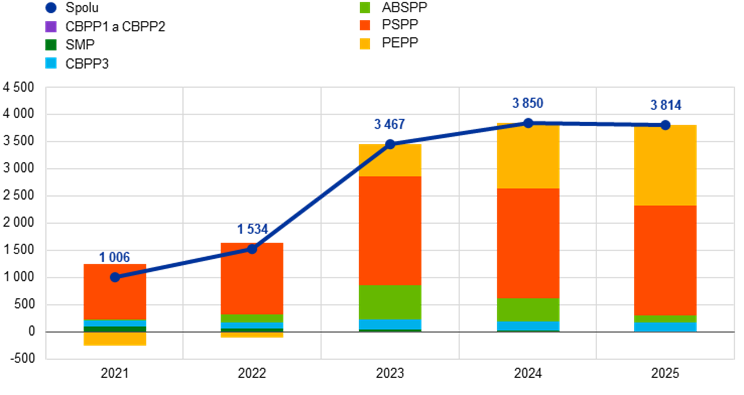 Až do roku 2022 súvaha ECB expandovala (graf 1), predovšetkým v dôsledku priameho nákupu cenných papierov v programe nákupu aktív (asset purchase programme – APP) a núdzovom pandemickom programe nákupu aktív (pandemic emergency purchase programme – PEPP) v rámci realizácie menovej politiky Eurosystému.[13] Nárast v roku 2022 bol miernejší v dôsledku ukončenia čistého nákupu cenných papierov v rámci programu PEPP od konca marca 2022 a v rámcu programu APP od 1. júla 2022. V roku 2023 a 2024 sa veľkosť súvahy zmenšila vzhľadom na postupnú redukciu objemu aktív nadobudnutých v rámci programu APP v dôsledku len čiastočného reinvestovania istiny zo splatených cenných papierov od marca do júna 2023 a úplného ukončenia týchto reinvestícií od júla 2023. K redukcii súvahy ECB v roku 2024 prispelo i postupné znižovanie objemu aktív programu PEPP v dôsledku len čiastočných reinvestícií istiny v druhej polovici roka. Tieto reinvestície boli ukončené na konci roka 2024.