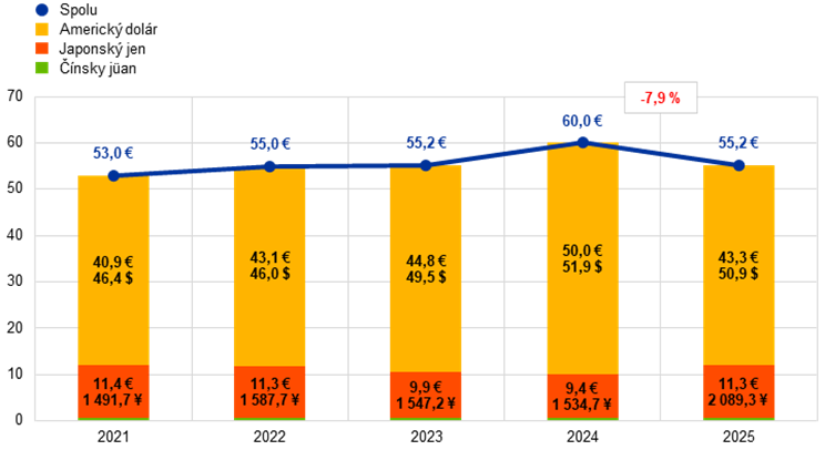 Hlavnou zložkou devízových rezerv ECB je aj naďalej americký dolár, ktorý ku koncu roka 2025 tvoril približne 78 % ich celkového objemu.