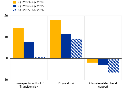Still, we see a striking shift on transition risk, with banks expecting a broadly unchanged impact of transition risk on their lending conditions over the next 12 months. This is significantly lower than the reported realised impact in the previous two survey rounds (Chart 1, panel b). It may be related to firms’ progress on the green transition. Banks also reported a beneficial impact of climate-related fiscal support over the past 12 months, improving the chances of loan approval and mitigating the financing costs for firms managing the green transition. This easing impact is expected to increase over the next 12 months.