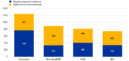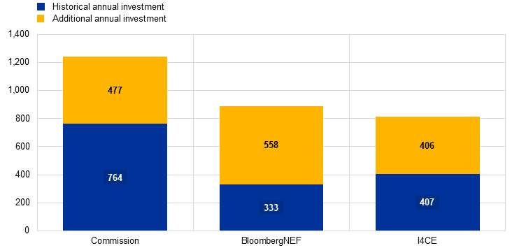 Focusing on the estimates of additional green investment needs − the amounts needed each year on top of continued investment of past amounts – these range between €558 billion according to BloombergNEF (BNEF) and around €400 billion according to the International Energy Agency (IEA) and the Institute for Climate Economics (I4CE) until 2030.