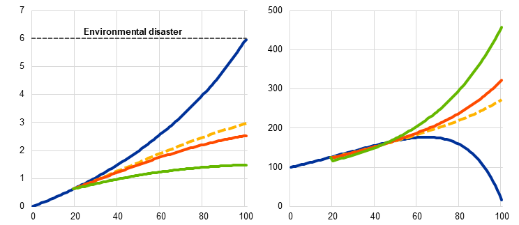 Building on this framework, we simulate four scenarios that sequentially introduce policy measures to correct misaligned private incentives and address structural barriers to the green transition. Chart 8 shows, for each scenario, developments in the simulated economy over 100 years, focusing on the advantage of “clean” over “dirty” technology (panel a), the share of “dirty” output in total output (panel b), the rise in temperature (panel c), and total output net of climate damage (panel d). The first scenario simulates a laissez-faire benchmark without policy intervention. The subsequent scenarios progressively add layers of policy intervention, introduced at year 20 for clear visualisation. The second scenario introduces carbon taxes to correct for unpriced environmental externalities. We calibrate this scenario to match the “current policies scenario” from the International Energy Agency’s (IEA) World Energy Outlook 2025, in which global temperatures are projected to reach just under 3°C above pre-industrial levels by 2100. The third scenario additionally incorporates subsidies for R&D and clean production to further realign incentives towards clean innovation. We calibrate the policy interventions here to match the IEA’s “stated policies scenario”, which incorporates much greater support for green innovation than the “current policies scenario” and reflects a greater degree of policy ambition. Under this scenario, global temperatures reach +2.5°C by the end of this century. The fourth scenario also introduces structural policies that reduce the technology-switching frictions.