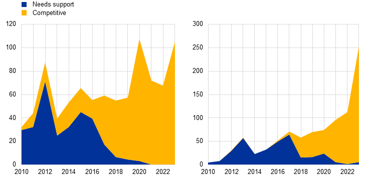 Policies providing support for green R&D can have a positive economic impact in generating competitive new technologies. ECB research shows that high-polluting firms exposed to environmental policies that support green innovation increase their filing of green patents (Benatti et al., 2025). Moreover, there is no impact on filing of other types of patent, so support for green innovation does not crowd out other types of innovation. Indeed, Dechezleprêtre et al. (2013) find that clean technology patents receive, on average, 43% more patent citations than “dirty” patents, which shows wider technological applications and therefore economic benefits from subsidising green technologies.