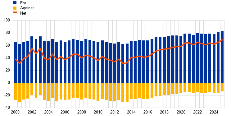 More than a quarter of a century after its introduction, the euro is enjoying record support among euro area citizens. Introduced in 1999 and brought into full circulation in 2002, the euro has become one of the most tangible symbols of European integration and is firmly ingrained in citizens’ daily lives. This is reflected in the results of the European Commission’s latest Standard Eurobarometer survey (2025), which showed that 83% of euro area respondents are in favour of the single currency – an all-time high, following a steady rise in support since the mid-2010s (Chart A).