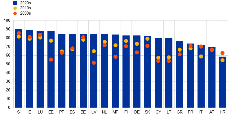 Support for the euro is now both high and widespread, with cross-country differences having narrowed significantly. In nearly all euro area countries, support for the euro has increased in the 2020s compared with the previous two decades, especially in countries with lower initial approval rates (Chart B). Cyprus, Lithuania, Latvia, Portugal and Spain have recorded increases of around 20 percentage points in recent years. In Cyprus, Portugal and Spain, this reflects a recovery in confidence in the single currency following the sovereign debt crisis. Support in Latvia and Lithuania rose around the time when these countries adopted the euro in 2014 and 2015 respectively. Even in countries where approval rates were already high, such as Slovenia, Ireland and Luxembourg, support has climbed from around 80% to close to 90%.