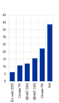 Transition and physical climate risks are assessed using top-down models that leverage the data and results submitted by banks. By combining firm-level information from the AnaCredit dataset and starting point information on banks’ probabilities of default from the EU-wide stress test, Abbondanza et al. (2025) investigate the impact on the probability of default relating to firms’ transition risk arising from green investments aimed at reducing carbon emissions. They find a moderate Common Equity Tier 1 (CET1) impact in addition to the EU-wide depletion of around 74 basis points, mostly driven by exposure to energy-intensive sectors. Focusing on flood risk, Abbondanza et al. (2025) integrate physical risk from the Nationally Determined Contributions scenario outlined by the Network for Greening the Financial System (NGFS)[3] into the EBA’s adverse scenario and estimate that banks’ credit risk losses increase by an additional 77 basis points.