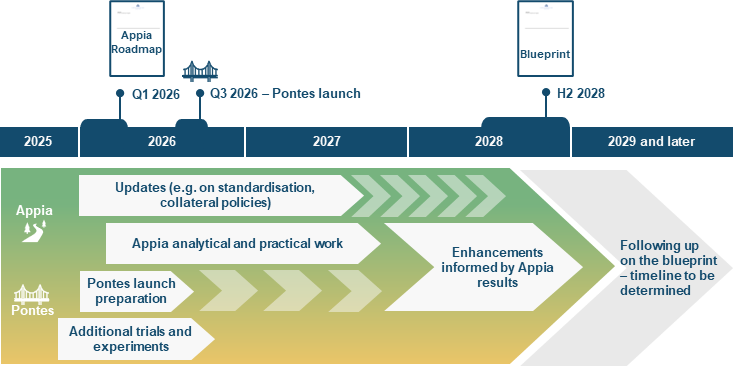 While the Appia analysis is ongoing, market participants will already be able to settle DLT-based transactions in central bank money through Pontes. Pontes will provide a bridge between market DLT infrastructures and the Eurosystem’s TARGET Services as early as end-Q3 2026. This will allow the financial industry to develop and scale their DLT-based offerings, with the certainty that they can use the safest possible settlement asset. Pontes will be enhanced with additional functionalities in the coming years, including on the basis of input from Appia. This input will be provided in a staggered manner, in order to allow incremental enhancements to the Pontes product to be implemented on aspects for which analyses have been completed while ongoing research continues to address other aspects within Appia. Eventually, the enhancements to the Pontes product will allow it to evolve into a component of the envisaged Appia ecosystem.