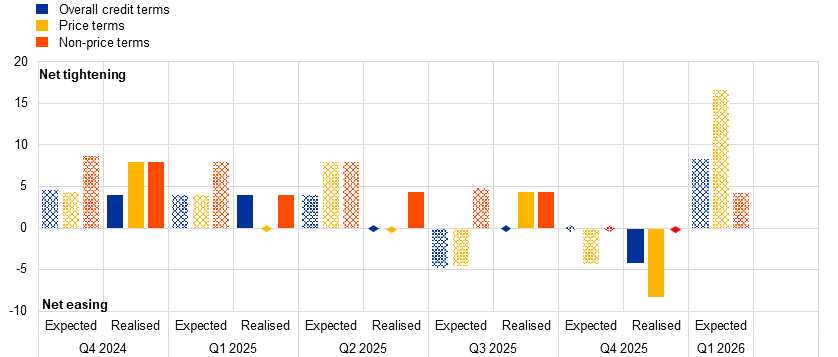 - Price and non-price credit terms and conditions remained largely unchanged between September 2025 and December 2025, with a slight easing of price terms across most counterparties. This easing appeared to be primarily driven by general market liquidity conditions, competition from other institutions, and the financial strength of counterparties. Looking ahead to the first quarter of 2026, some tightening of credit terms was expected across the board, but in particular for hedge funds. Tightening expectations were more pronounced for price terms than non-price terms (Chart 1).