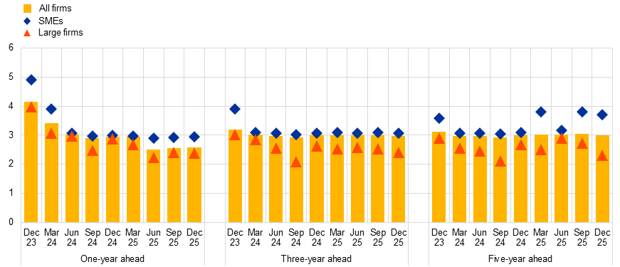 Notes: Survey-weighted median of euro area firms’ expectations for euro area inflation in one year, three years and five years, calculated using survey weights. The statistics are computed after trimming the data at the country-specific 1st and 99th percentiles. The data included in the chart refer to Question 31 of the survey.