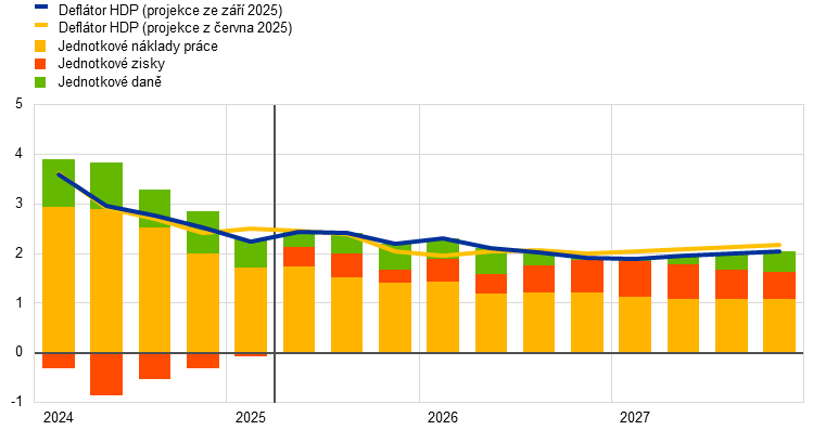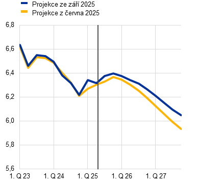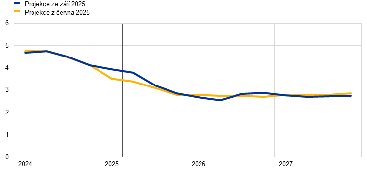 Výhled inflace odpovídá tomu, že se inflace stabilizuje poblíž 2% střednědobého cíle. Celková inflace, měřená harmonizovaným indexem spotřebitelských cen (HICP), by měla po zbytek roku 2025 kolísat poblíž 2 %, v roce 2026 klesnout na 1,7 % a následně se v roce 2027 zotavit na úroveň 1,9 %. Pokles v roce 2026 odráží další postupné snižování cen neenergetických složek, zatímco růst cen energií by měl zůstat volatilní, ale v horizontu projekcí by měl zesílit, částečně v důsledku spuštění systému EU pro obchodování s emisemi ETS2 v roce 2027. Očekává se, že ceny potravin zpočátku i nadále porostou rychleji, neboť se projeví zpožděné dopady dřívějšího růstu cen mezinárodních potravinářských komodit. V letech 2026 a 2027 by však růst měl zmírnit na úroveň mírně nad 2 %. Inflace měřená HICP bez započtení energií a potravin (HICPX) by měla klesat s tím, jak poleví mzdové tlaky a zmírní se růst cen služeb a jak se posilování eura projeví v cenovém řetězci a omezí růst cen zboží. Očekává se, že nižší růst mezd vyplývající z již realizované kompenzace ztrát reálných mezd v minulosti a oživení růstu produktivity povedou k výrazně pomalejšímu růstu jednotkových mzdových nákladů. V porovnání s projekcemi z června 2025 byl výhled celkové inflace měřené HICP revidován pro rok 2025 i 2026 o 0,1 procentního bodu směrem nahoru. Důvodem jsou vyšší aktuální údaje o cenách energetických komodit i předpoklady o jejich budoucím vývoji a také zpožděné účinky vyšších mezinárodních cen potravinářských komodit, které převažují nad posílením eura. Očekává se, že v roce 2027 budou převládat zpožděné účinky posilování eura, což povede k revizi o 0,1 procentního bodu směrem dolů.