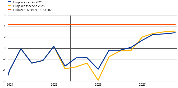 Obchodní cla a související nejistota přispěly během první poloviny roku 2025 k výrazným výkyvům hospodářské aktivity a jejímu uspíšení, zejména v Irsku. Odeznívání těchto faktorů ve druhé polovině roku by mělo přinést další volatilitu, která znesnadňuje interpretaci signálů o základní dynamice hospodářství eurozóny. Odhlédneme-li od volatility způsobené výkyvy údajů o Irsku, hospodářský růst ve zbytku eurozóny byl stabilnější a očekává se, že tomu tak bude i ve druhé polovině roku. I když nová obchodní dohoda mezi USA a EU přináší vyšší cla na vývoz z eurozóny do Spojených států, pomohla snížit nejistotu v oblasti obchodní politiky. Později ve sledovaném období by měl hospodářský růst v eurozóně za podpory několika faktorů posilovat. Rostoucí reálné mzdy a zaměstnanost spolu s novými vládními výdaji na infrastrukturu a obranu (zejména v Německu) by měly posílit domácí poptávku v eurozóně. Dále se předpokládá, že výhled hospodářského růstu podpoří také méně restriktivní podmínky financování, které odrážejí především nedávná měnová rozhodnutí, a oživení zahraniční poptávky v roce 2027. Průměrné meziroční tempo růstu reálného HDP by mělo dosáhnout úrovně 1,2 % v roce 2025, 1,0 % v roce 2026 a 1,3 % v roce 2027. V porovnání s makroekonomickými projekcemi odborníků Eurosystému z června 2025 byl výhled růstu HDP pro rok 2025 revidován o 0,3 procentního bodu směrem nahoru, což odráží lepší aktuální údaje, než se očekávalo, a přenosový efekt revizí údajů za minulá období. Vzhledem k tomu, že ne všechna překvapivá data se týkají výraznějšího uspíšení hospodářské aktivity oproti předpokladům, očekává se, že ve druhé polovině roku budou kompenzována pouze částečně. Posílení eura a slabší zahraniční poptávka (částečně související s poněkud vyššími cly oproti předpokladům v červnových projekcích) vedly pro rok 2026 k revizi o 0,1 procentního bodu směrem dolů. Projekce pro rok 2027 zůstává beze změny.[1]