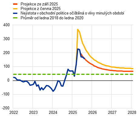 Poznámky: V panelu a) odkazují údaje na „očištěný“ ukazatel nejistoty obchodní politiky (viz poznámka pod čarou 5). Poslední údaje jsou za červenec 2025. U panelu b) nezahrnují odhady dopad cel na metodické předpoklady (např. směnného kurzu).