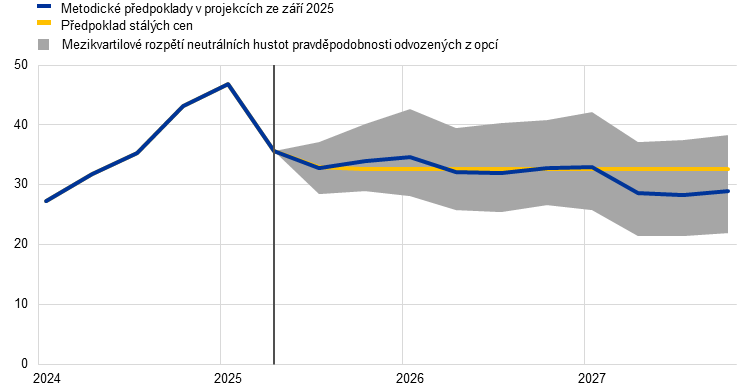 Poznámky: Revize jsou vyjádřeny v procentech v případě úrovní, v procentních bodech v případě tempa růstu a v p. a. Revize tempa růstu a úrokových sazeb se vypočítávají na základě údajů zaokrouhlených na jedno desetinné místo, zatímco revize vykázané jako procentní změny se vypočítávají z nezaokrouhlených hodnot. Metodické předpoklady o úrokových sazbách v eurozóně a cenách komodit vycházejí z tržních očekávání s datem pro uzávěrku údajů 15. srpna 2025. Ceny ropy se týkají spotových cen a cen futures ropy Brent. Ceny plynu se týkají spotových cen a cen futures na plyn na nizozemské burze TTF. Ceny elektřiny se týkají průměrné velkoobchodní spotové ceny a ceny futures v pěti největších zemích eurozóny. „Syntetická“ cena futures na povolenky v systému ETS1 (dále též „EUA“) se odvozuje jako lineárně interpolovaná hodnota dvou nejbližších futures na EUA na Evropské energetické burze na konci měsíce. Měsíční ceny futures na EUA jsou poté průměrovány tak, aby poskytly ekvivalent roční frekvence. Vzhledem k neexistenci významnějšího obchodování s povolenkami v rámci systému ETS2 stanovili odborníci sestavující projekce předpoklady o cenách na úrovni prahové ceny, při jejímž překročení budou emitovány další povolenky, přičemž cena byla aktualizována za použití cen v roce 2027 (další podrobnosti viz box nazvaný „Posouzení dopadu transformačních opatření souvisejících se změnou klimatu na hospodářský růst a inflaci“ v projekcích z prosince 2024 sestavených odborníky Eurosystému). Vývoj cen komodit implikují trhy s futures v deseti pracovních dnech končících dnem uzávěrky. Dvoustranné směnné kurzy by měly v horizontu projekcí zůstat beze změny, a to na průměrné úrovni platné během deseti pracovních dnů končících dnem uzávěrky. Předpoklady nominálních výnosů z desetiletých státních dluhopisů v eurozóně vycházejí z průměru výnosů desetiletých dluhopisů těchto zemí váženého hodnotami ročního HDP. Existují-li potřebné údaje, jsou nominální výnosy desetiletých státních dluhopisů jednotlivých zemí definovány jako výnosy referenčních desetiletých dluhopisů prodloužené za použití forwardových nominálních výnosů odvozených k datu uzávěrky z odpovídajících výnosových křivek jednotlivých zemí. V případě ostatních zemí jsou výnosy desetiletých státních dluhopisů jednotlivých zemí definovány jako výnos referenčních desetiletých dluhopisů prodloužený za použití konstantního rozpětí (pozorovaného k datu uzávěrky) vůči předpokládané bezrizikové dlouhodobé úrokové sazby v eurozóně.