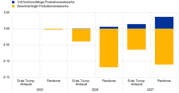 Die makroökonomischen Auswirkungen auf den Euroraum sind in der ersten divergierenden Entwicklung minimal. Im zweiten Szenario sind die Auswirkungen hingegen beträchtlich. Letzteres berücksichtigt extremere Lieferkettenstörungen wie sie während der Pandemie auftraten. Betrachtet man zunächst die Ergebnisse einer Volkswirtschaft mit voll funktionsfähigen Produktionsnetzwerken und verwendet das ECB-BASE-Modell, so würde sich in dem Szenario mit ähnlichen Lieferengpässen wie während der ersten Trump-Amtszeit nur ein minimaler Inflationsdruck ergeben. Hier würde die HVPI-Inflation im Jahr 2027 um weniger als 0,1 Prozentpunkte höher ausfallen (siehe Abbildung 20, Grafik b, blaue Balkenabschnitte). Das Szenario mit ähnlichen Schocks wie während der Pandemie würde zu stärker ausgeprägten Inflationseffekten führen: Die HVPI-Inflation würde im Jahr 2027 um bis zu 0,15 Prozentpunkte höher ausfallen (siehe Abbildung20, Grafik b, blaue Balkenabschnitte). In beiden Sensitivitätsanalysen sind die Auswirkungen auf das reale BIP vernachlässigbar oder leicht positiv. Dies ist darauf zurückzuführen, dass unveränderte Zinssätze unterstellt werden, was angesichts der höheren Inflation einen Rückgang der realen Zinssätze bedeutet, der die Konjunktur ankurbeln würde (siehe Abbildung 20, Grafik a, blaue Balkenabschnitte). Die Analyse wird anhand eines Mehrländer- und Mehrsektorenmodells erweitert, das Input-Output-Verflechtungen berücksichtigt. Dadurch kommen Beeinträchtigungen der Produktionsnetzwerke in anderen Regionen zu den Lieferkettenstörungen hinzu. Durch diese Annahme verringert sich die Substituierbarkeit innerhalb der Produktionsketten und es käme zu stärkeren Auswirkungen (siehe Abbildung 20, gelbe Balkenabschnitte). In diesem Fall könnte die Inflation 2027 im Szenario der ersten Trump-Amtszeit um bis zu 0,1 Prozentpunkte und im extremeren Pandemieszenario um knapp 0,25 Prozentpunkte höher liegen als im Basisszenario, und das BIP-Wachstum wäre im Vergleich leicht gedämpft.[19]