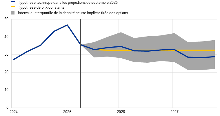 1. La date d’arrêté des hypothèses techniques était le 15 août 2025. Les projections macroéconomiques pour l’environnement international et la zone euro ont été finalisées le 28 août 2025.