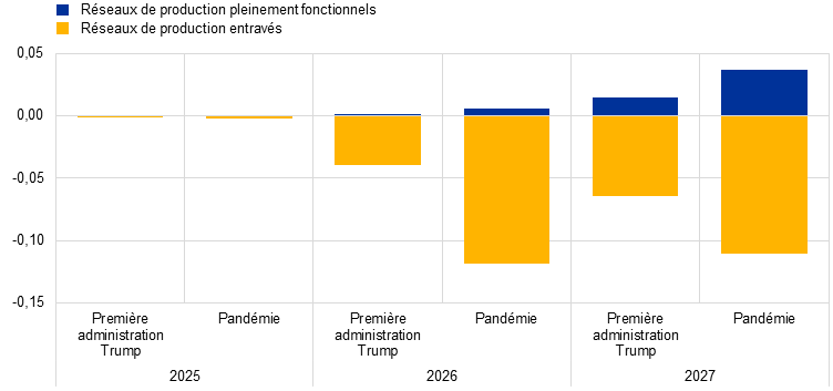 Les effets macroéconomiques sur la zone euro sont minimes dans la première trajectoire différente mais significatifs dans la seconde, avec des perturbations plus extrêmes des chaînes d’approvisionnement, comme pendant la pandémie. Si l’on s’intéresse d’abord aux résultats obtenus avec une économie dotée de réseaux de production pleinement opérationnels, et que l’on utilise le modèle ECB-BASE, dans la trajectoire présentant des goulets d’étranglement au niveau de l’offre similaires à ceux observés durant la première administration Trump, seules des tensions inflationnistes minimes apparaissent, la hausse de l’IPCH progressant de moins de 0,1 point de pourcentage en 2027 (graphique 20, partie b, barres bleues). Le scénario supposant des chocs semblables à ceux qui se sont produits pendant la pandémie donnerait lieu à des effets plus prononcés sur l’inflation, la hausse de l’IPCH pouvant atteindre 0,15 point de pourcentage de plus en 2027 (graphique 20, partie b, barres bleues). Dans les deux analyses de sensibilité, l’incidence sur le PIB en volume est négligeable ou légèrement positive, reflétant l’hypothèse de taux d’intérêt inchangés qui, compte tenu de l’inflation plus élevée, implique une baisse des taux d’intérêt réels qui stimulerait l’activité (graphique 20, partie a, barres bleues). L’analyse est étendue à l’aide d’un modèle multi-pays et multi-sectoriel qui tient compte des liens entrées-sorties, l’enrayement des réseaux de production d’autres régions venant s’ajouter aux blocages des chaînes d’approvisionnement. Cette hypothèse réduit la substituabilité au sein des chaînes de production et se traduirait par des effets plus prononcés (graphique 20, barres jaunes). Dans ce cas, par rapport au scénario de référence, l’inflation en 2027 pourrait être jusqu’à 0,1 point de pourcentage plus élevée dans le scénario relatif à la première administration Trump et près de 0,25 point de pourcentage plus forte dans le scénario plus extrême relatif à la pandémie, tandis que la croissance du PIB serait légèrement ralentie[19].
