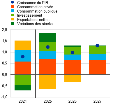 Les droits de douane et l’incertitude qui y est associée ont contribué à de fortes fluctuations de l’activité économique au premier semestre 2025, avec une anticipation de l’activité, en particulier en Irlande. La dissipation de ces facteurs au second semestre de l’année devrait entraîner de nouveaux épisodes de volatilité et brouiller les signaux relatifs à la dynamique sous-jacente de l’économie de la zone euro. Abstraction faite de la volatilité provoquée par les fluctuations des données irlandaises, la croissance économique dans le reste de la zone euro était en fait plus stable, et devrait le rester au second semestre 2025. Si le nouvel accord commercial conclu entre les États-Unis et l’Union européenne (UE) suppose une augmentation des droits de douane sur les exportations de la zone euro aux États-Unis, il a contribué à réduire l’incertitude quant aux politiques commerciales. Plus tard sur l’horizon de projection, la croissance économique de la zone euro devrait se renforcer, soutenue par plusieurs facteurs. La hausse des salaires réels et de l’emploi, conjuguée à de nouvelles dépenses publiques en matière d’infrastructures et de défense, principalement en Allemagne, devrait stimuler la demande intérieure dans la zone euro. En outre, des conditions de financement moins restrictives, reflétant essentiellement les récentes décisions de politique monétaire, et un rebond de la demande extérieure en 2027 soutiendraient également les perspectives de croissance. La croissance annuelle moyenne du PIB en volume devrait s’établir à 1,2 % en 2025, 1,0 % en 2026 et 1,3 % en 2027. Par rapport aux projections macroéconomiques de juin 2025 établies par les services de l’Eurosystème, les perspectives de croissance du PIB ont été révisées à la hausse de 0,3 point de pourcentage pour 2025, traduisant des données meilleures qu’anticipé ainsi qu’un acquis de croissance résultant des révisions des données historiques. Étant donné que les surprises s’agissant des données ne sont pas toutes liées à une anticipation de l’activité plus importante que prévu, elles ne devraient être que partiellement compensées au second semestre de l’année. L’appréciation de l’euro et l’affaiblissement de la demande extérieure (du fait notamment de droits de douane légèrement plus élevés qu’anticipé dans les projections de juin) ont entraîné une révision à la baisse de 0,1 point de pourcentage pour 2026. La projection pour 2027 reste inchangée[1].