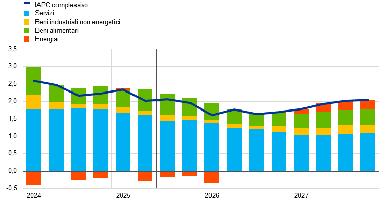 Le prospettive per l’inflazione sono coerenti con una stabilizzazione intorno all’obiettivo del 2% a medio termine. L’inflazione complessiva, misurata sull’indice armonizzato dei prezzi al consumo (IAPC), non evidenzierebbe alcuna tendenza significativa nel resto del 2025, mantenendosi attorno al 2%, per poi scendere all’1,7% nel 2026 e quindi risalire all’1,9% nel 2027. La diminuzione prospettata nel 2026 riflette un ulteriore graduale calo per le componenti non energetiche, mentre per i beni energetici l’inflazione dovrebbe continuare a mostrare variabilità ma aumentare nell’orizzonte di proiezione, in parte per effetto dell’avvio del sistema dell’UE per lo scambio di quote di emissione (ETS2) nel 2027. Per quanto riguarda la componente dei beni alimentari, ci si attende che l’inflazione resti inizialmente elevata, con la trasmissione degli effetti ritardati dei passati rincari delle materie prime alimentari sui mercati internazionali, ma poi dovrebbe scendere portandosi su livelli lievemente superiori al 2% nel 2026 e nel 2027. L’inflazione misurata sullo IAPC al netto delle componenti energetica e alimentare (HICPX) dovrebbe diminuire con l’attenuarsi delle pressioni salariali e la moderazione dell’inflazione relativa ai servizi, e man mano che l’apprezzamento dell’euro si trasmetterà lungo la catena di formazione dei prezzi e frenerà l’inflazione dei beni. Il rallentamento delle retribuzioni, essendo state recuperate le passate perdite nei salari reali, unitamente a una ripresa della crescita della produttività, dovrebbe determinare una significativa decelerazione del costo del lavoro per unità di prodotto. Rispetto alle proiezioni dello scorso giugno, le prospettive per l’inflazione complessiva misurata sullo IAPC sono state riviste al rialzo di 0,1 punti percentuali sia per il 2025 che per il 2026 a causa di dati effettivi e ipotesi sui prezzi delle materie prime energetiche più elevati, nonché degli effetti ritardati dei rincari delle materie prime alimentari sui mercati internazionali, che hanno più che compensato l’apprezzamento dell’euro. Nel 2027 si ritiene che prevarranno gli effetti ritardati del rafforzamento dell’euro, da cui deriva una revisione al ribasso di 0,1 punti percentuali.