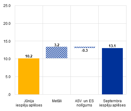 Salīdzinājumā ar 2025. gada jūnija iespēju aplēsēm galvenās tehnisko pieņēmumu pārmaiņas ir augstākas naftas cenas, zemākas gāzes un izejvielu cenas un augstāks euro kurss, bet finanšu pieņēmumi pamatā nav mainījušies. Pieņēmumi par naftas cenām 2025.–2027. gadā koriģēti un paaugstināti vidēji aptuveni par 3 % un pieņēmumi par elektroenerģijas cenām – aptuveni par 2 %, savukārt pieņēmumi par gāzes vairumtirdzniecības cenām koriģēti un nedaudz samazināti. Tiek pieņemts, ka arī pirmās ES emisijas kvotu tirdzniecības sistēmas (ETS1) kvotu cena ir nedaudz zemāka, savukārt otrās ES emisijas kvotu tirdzniecības sistēmas (ETS2) cena saglabājās nemainīga. Neenerģijas izejvielu cenas koriģētas un nedaudz samazinātas. Kopš jūnija iespēju aplēsēm euro kurss attiecībā pret ASV dolāru pieaudzis par 3.3 % (nominālajā efektīvajā izteiksmē – par 2.3 %). Pieņēmumi par procentu likmēm pamatā nav mainījušies.