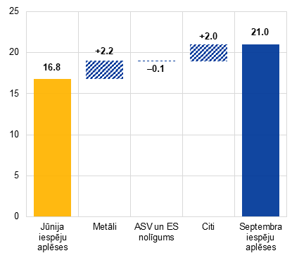 Lai gan ASV tarifi kopš 2025. gada jūnija iespēju aplēšu datu aktualizēšanas pēdējā datuma turpinājuši paaugstināties, izziņotās provizoriskās vienošanās par tirdzniecības darījumiem un ASV un Ķīnas tarifu pamiera pagarināšana mazina tirdzniecības politikas nenoteiktību, kas tomēr joprojām ir paaugstināta. Pamatscenārija pieņēmumi par tarifiem un tirdzniecības politikas nenoteiktību sīkāk aplūkoti 1. ielikumā. Joprojām notiek ASV administrācijas 232. sadaļas izmeklēšana attiecībā uz nozaru tarifiem farmācijas produktiem, pusvadītājiem un kokmateriāliem, tādējādi radot augšupvērstu risku pieņēmumiem par tarifiem.