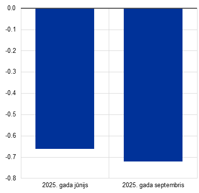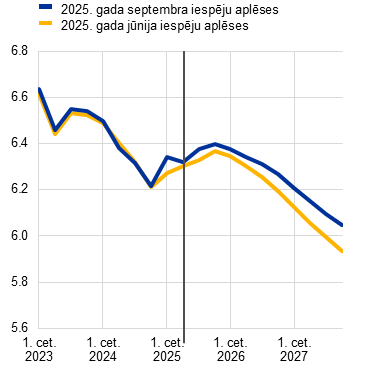 Inflācijas perspektīva ir saskaņā ar inflācijas stabilizēšanos aptuveni 2 % vidējā termiņa mērķa līmenī. Paredzams, ka kopējā inflācija, ko mēra ar saskaņoto patēriņa cenu indeksu (SPCI), atlikušajos 2025. gada mēnešos virzīsies horizontāli aptuveni 2 % līmenī un pēc tam 2026. gadā saruks līdz 1.7 %, bet pēc tam 2027. gadā atkal pieaugs līdz 1.9 %. Kritums 2026. gadā atspoguļo turpmāku pakāpenisku neenerģijas komponentu sarukumu, savukārt enerģijas cenu inflācija arī turpmāk būs svārstīga, bet iespēju aplēšu periodā pieaugs, daļēji tāpēc, ka 2027. gadā sāks darboties otrā ES emisijas kvotu tirdzniecības sistēma (ETS2). Gaidāms, ka pārtikas cenu inflācija sākotnēji saglabāsies paaugstināta sakarā ar starptautisko pārtikas izejvielu cenu agrākā kāpuma novēloto ietekmi, bet 2026. un 2027. gadā kāpuma temps kļūs lēnāks (nedaudz virs 2 %). Gaidāms, ka SPCI inflācija (neietverot enerģijas un pārtikas cenas; SPCIX) pazemināsies, mazinoties darba samaksas spiedienam un pakalpojumu cenu inflācijai kļūstot mērenākai un euro kursa kāpumam atspoguļojoties dažādos cenu noteikšanas posmos un ierobežojot preču cenu inflāciju. Gaidāms, ka darba samaksas pieauguma kritums pēc tam, kad būs atgūti agrākie reālās darba samaksas zaudējumi, kopā ar darba ražīguma pieauguma atjaunošanos noteiks būtiski lēnāku vienības darbaspēka izmaksu pieaugumu. Salīdzinājumā ar 2025. gada jūnija iespēju aplēsēm kopējās SPCI inflācijas perspektīva gan 2025., gan 2026. gadam koriģēta un paaugstināta par 0.1 procentu punktu sakarā ar augstākiem enerģijas izejvielu cenu rezultātiem un pieņēmumiem, kā arī augstāku starptautisko pārtikas izejvielu cenu novēloto ietekmi, kas ar uzviju kompensē euro kursa kāpumu. Tiek uzskatīts, ka 2027. gadā euro kursa kāpuma novēlotā ietekme dominēs, tāpēc attiecīgi veikta lejupvērsta korekcija par 0.1 procentu punktu.