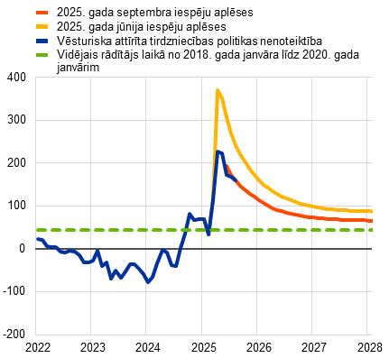 5. Dati balstās uz tirdzniecības politikas nenoteiktības "nekoriģēto" rādītāju, kas ir "attīrīts", lai novērstu aplēsto plašsaziņas līdzekļu uzmanības ietekmi uz nenoteiktību, kas nav saistīta ar tirdzniecības politiku, efektīvajām tarifu likmēm, finanšu apstākļiem un piegādes ķēdes spiedienu. 2025. gada jūnija iespēju aplēšu 2. ielikuma "ASV tarifi un tirdzniecības politikas nenoteiktība" B attēlā atspoguļotie pieņēmumi attiecās uz nekoriģēto tirdzniecības politikas nenoteiktības rādītāju, savukārt 1. ielikuma B attēlā a) panelis atspoguļo "attīrīto" rādītāju.