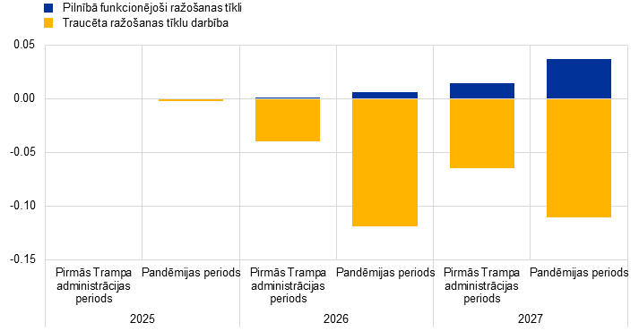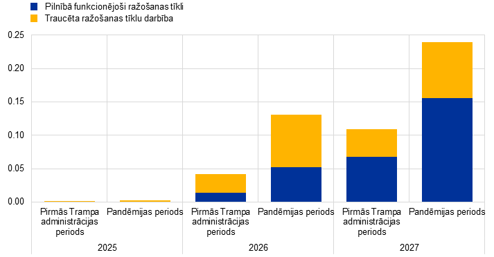 Pirmās alternatīvās tendences gadījumā makroekonomiskā ietekme uz eurozonu ir minimāla, bet otrās alternatīvās tendences gadījumā tā ir būtiska un tāpat kā pandēmijas laikā ietver nopietnākus piegādes ķēžu pārrāvumus. Vispirms pievēršoties rezultātiem apstākļos, kad ražošanas tīkli tautsaimniecībā ir pilnībā funkcionējoši, un izmantojot ECB-BASE modeli, scenārijā, kurā vērojamas tādas pašas piegādes problēmas kā pirmās Trampa administrācijas laikā, rastos tikai minimāls inflācijas spiediens un SPCI inflācija 2027. gadā būtu mazāk par 0.1 procentu punktu augstāka (20. attēls, b) panelis, zilie stabiņi). Scenārijā, kurā šoki ir līdzīgi pandēmijas periodā piedzīvotajiem šokiem, ietekme uz inflāciju būtu būtiski spēcīgāka un SPCI inflācija 2027. gadā būtu par 0.15 procentu punktiem augstāka (20. attēls, b) panelis, zilie stabiņi). Abās jutīguma analīzēs ietekme uz reālo IKP ir nenozīmīga vai nedaudz pozitīva, atspoguļojot pieņēmumu par nemainīgām procentu likmēm, kas, ņemot vērā augstāku inflāciju, ietver reālo procentu likmju kritumu, kas stimulētu aktivitāti (20. attēls, a) panelis, zilie stabiņi). Lai analīze būtu plašāka, izmantots daudzvalstu un daudznozaru modelis, kurā ņemtas vērā saiknes starp ielaidi un izlaidi, kas nosaka, ka citos reģionos papildus piegādes ķēžu traucējumiem cieš arī ražošanas tīkli. Šāds pieņēmums samazina ražošanas ķēžu aizstājamību, izraisot izteiktāku ietekmi (20. attēls, dzeltenie stabiņi). Šajā gadījumā salīdzinājumā ar pamatscenāriju scenārijā, kas līdzinās pirmās Trampa administrācijas laikam, inflācija 2027. gadā varētu būt par 0.1 procentu punktu augstāka, savukārt smagākajā scenārijā, kas līdzinās pandēmijas laikam, – gandrīz par 0.25 procentu punktiem augstāka, un IKP pieaugums būtu nedaudz ierobežots.[19]