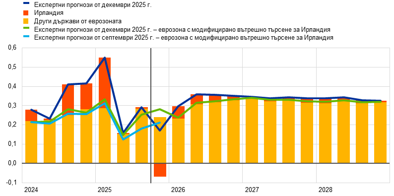Източници: Икономически прогнози на ОИСР, 4 декември 2025 г., Прогнози на Consensus Economics, 11 декември 2025 г. (данните за 2027 г. и 2028 г. са взети от проучването през октомври 2025 г.); Икономически прогнози на Европейската комисия – есен 2025 г., 17 ноември 2025 г.; ЕЦБ – Анкета на професионалните прогностици, 31 октомври 2025 г. и Перспективи за световната икономика на МВФ, 14 октомври 2025 г.