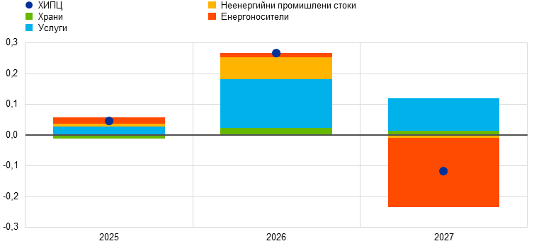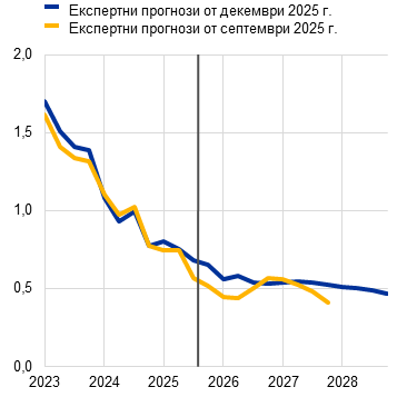 Прогнозира се инфлацията да намалее от 2,1% през 2025 г. до 1,9% през 2026 г. и след това до 1,8% през 2027 г., след което през 2028 г. да се повиши до определеното от ЕЦБ целево равнище от 2% в средносрочен план. Очакваният спад на общата инфлация (измерена чрез хармонизирания индекс на потребителските цени – ХИПЦ) в началото на 2026 г. отразява низходящ базов ефект, произтичащ от енергийните цени, докато инфлацията при неенергийните компоненти би трябвало да продължи да намалява през цялата 2026 г. Предвижда се приносът на енергийната инфлация в общата инфлация да остане слаб до края на 2027 г., след което да нарасне осезаемо през 2028 г. в резултат на очакваното прилагане на схемата на ЕС за търговия с емисии 2 (СТЕ2), с възходящ ефект от 0,2 процентни пункта върху общата инфлация. Очаква се ХИПЦ инфлацията без компонента енергоносители да спадне от 2,5% през 2025 г. до 2,2% през 2026 г. и 2,0% през 2027 г. и 2028 г. Прогнозира се инфлацията на храните да намалее осезаемо с отслабването на ефектите от предишни увеличения на цените на хранителните суровини в световен план и от неблагоприятните климатични условия през лятото. Смята се, че тя ще се стабилизира на равнище малко над 2% от края на 2026 г. Прогнозата за ХИПЦ инфлацията без компонентите енергоносители и храни е тя да се забави от 2,4% през 2025 г. до 2,0% през 2028 г. с отслабването на инфлацията при услугите в условия на намаляващ натиск от страна на разходите за труд и поради факта, че поскъпването на еврото в предишни периоди ще намери отражение във веригата на ценообразуване, потискайки инфлацията на стоките. Растежът на заплатите би следвало да продължи да се забавя през 2026 г., а впоследствие да се стабилизира на равнище около 3%, за което да допринесе устойчивият пазар на труда и ръст на производителността малко под 1%. Очаква се растежът на разходите за труд на единица продукция да се забави, макар че се смята, че въздействието му върху инфлацията ще бъде донякъде неутрализирано от постепенно възстановяване на нормата на печалба в хода на прогнозния период. В сравнение с прогнозите от септември 2025 г. перспективата за общата ХИПЦ инфлация е ревизирана нагоре с 0,2 процентни пункта за 2026 г. поради изненадващите най-нови данни за ХИПЦ инфлацията и растежа на заплатите, като последните доведоха до съществена възходяща ревизия на перспективата за заплатите. Прогнозата за ХИПЦ инфлацията е ревизирана леко надолу за 2027 г. заради предполагаем по-малък принос на инфлацията на енергоносителите, тъй като въвеждането на СТЕ2 сега се очаква да бъде отложено от 2027 г. за 2028 г., макар да се счита, че този принос ще бъде отчасти неутрализиран от по-високата инфлация при услугите.