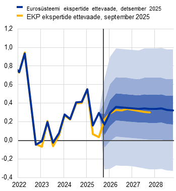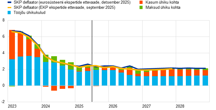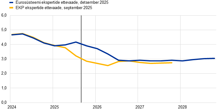 Inflatsioon peaks aeglustuma 2,1%-lt 2025. aastal 1,9%-le 2026. aastal ja 1,8%-le 2027. aastal ning hoogustuma seejärel 2028. aastal EKP keskpika aja eesmärgiks seatud 2% tasemele. Koguinflatsiooni (mõõdetuna ühtlustatud tarbijahinnaindeksi (ÜTHI) alusel) eeldatav aeglustumine 2026. aasta alguses kajastab energiahindadest tulenevat negatiivset baasefekti, samal ajal kui muude komponentide (v.a energia) inflatsioon peaks terve 2026. aasta jooksul jätkuvalt aeglustuma. Energiahindade inflatsiooni panus koguinflatsiooni peaks jääma peaaegu kuni 2027. aasta lõpuni tagasihoidlikuks ning suurenema siis 2028. aastal märkimisväärselt seoses ELi heitkogustega kauplemise süsteemi (HKS2) eeldatava rakendamisega, mis peaks suurendama koguinflatsiooni 0,2 protsendipunkti võrra. Energia komponenti arvestamata peaks ÜTHI-inflatsioon aeglustuma 2,5%-lt 2025. aastal 2,2%-le 2026. aastal ning 2,0%-le 2027. ja 2028. aastal. Toiduainehindade inflatsioon aeglustub tõenäoliselt märkimisväärselt, sest üleilmsete toidutoormehindade varasemate tõusude ja suve jooksul valitsenud ebasoodsate ilmaolude mõju taandub, ning 2026. aasta lõpu poole peaks see stabiliseeruma veidi üle 2% tasemel. ÜTHI-inflatsioon (v.a energia ja toiduained) peaks aeglustuma 2,4%-lt 2025. aastal 2,0%-le 2028. aastal, kuna tööjõukulude surve leevenemise keskkonnas aeglustub teenusehindade inflatsioon ja euro varasem kallinemine kandub üle hinnakujundusahelasse, pidurdades kaubahindade inflatsiooni. Palgakasv peaks 2026. aastal aeglustuma ning stabiliseeruma siis ligikaudu 3% juures. Seda toetavad vastupidav tööturg ja tootlikkuse kasv, mis jääb veidi alla 1%. Tööjõu ühikukulude kasv tõenäoliselt aeglustub, kuid selle mõju inflatsioonile peaks osaliselt tasakaalustama kasumimarginaalide järkjärguline elavnemine ettevaateperioodil. 2025. aasta septembri ettevaatega võrreldes on ÜTHI-koguinflatsiooni väljavaadet 2026. aastaks 0,2 protsendipunkti võrra ülespoole korrigeeritud. See kajastab hiljutisi üllatavaid andmeid ÜTHI-inflatsiooni ja palgakasvu kohta. Viimased toovad kaasa palgakasvu prognoosi märkimisväärse ülespoole korrigeerimise. ÜTHI-inflatsiooni prognoosi on 2027. aastaks veidi allapoole korrigeeritud. Selle põhjuseks on energiahindade inflatsiooni eeldatav väiksem mõju, kuna heitkogustega kauplemise süsteemi (HKS2) rakendamine peaks lükkuma 2027. aastalt edasi 2028. aastale. Samal ajal peaks seda mõju siiski osaliselt tasakaalustama teenusehindade kiirem inflatsioon.