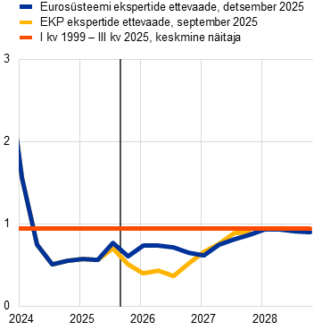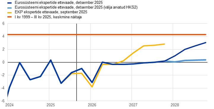 Euroala majandus on hoolimata keerulisest üleilmsest keskkonnast osutunud vastupidavaks. SKP reaalkasv hoogustus 2025. aasta kolmandas kvartalis 0,3%, mis ületas septembri ettevaate prognoosi. Sellele kasvule eelnesid esimese poolaasta volatiilsed suundumused, milles kajastus USA kõrgemate kaubandustollide ja seonduva ebakindluse tõttu tegevuste ettepoole toomise mõju. Samuti peegeldasid need suundumused järske kõikumisi Iirimaa andmetes. Euroala majanduskasvu peaks endiselt tagant tõukama peamiselt sisenõudlus, mida elavdavad reaalpalkade tõus ja tööhõive suurenemine olukorras, kus vastupanuvõimelistel tööturgudel on rekordiliselt madal töötuse määr. Sisemajandust peaksid toetama ka käesoleval aastal teatavaks tehtud valitsussektorite täiendavad kulutused taristu- ja kaitsevaldkonnas, eelkõige Saksamaal, ning alates 2024. aasta juunist tehtud baasintressimäärakärbetest tulenenud soodsamad rahastamistingimused. Euroalaväliselt peaks eksport järgmisel aastal hoogustuma, ehkki jätkuvalt esineb konkurentsivõime probleeme, millest mõned on struktuurilist laadi. See hoogustumine on seotud välisnõudluse elavnemisega kaubanduspoliitikast tingitud ebakindluse vähenemise keskkonnas ning toimub olenemata kõrgemate tollimaksude mõju järkjärgulisest avaldumisest. Eurosüsteemi ekspertide prognoosi kohaselt on SKP reaalkasv 2025. aastal 1,4%, 2026. aastal 1,2%, 2027. aastal 1,4% ja 2028. aastal 1,4%. 2025. aasta septembri ettevaatega võrreldes on SKP kasvu kogu ettevaateperioodiks ülespoole korrigeeritud, võttes arvesse oodatust paremaid näitajaid, kaubanduspoliitikaga seotud ebakindluse vähenemist, tugevamat välisnõudlust ja madalamaid energiatoorme hindu.[1]