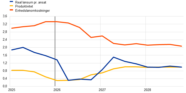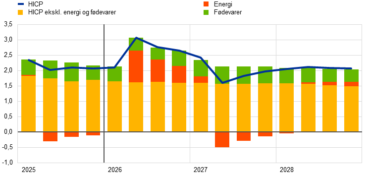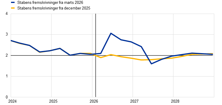 Inflationen, målt ved det harmoniserede forbrugerprisindeks (HICP), forudses at stige kraftigt til 3,1 pct. i 2. kvartal 2026 som følge af en kraftig stigning i energiinflationen forårsaget af krisen i Mellemøsten og derefter at falde i 3. kvartal til 2,8 pct. efter fald i råvarepriserne på energi, som kan udledes af futurespriserne. Ifølge basisfremskrivningerne vil energiinflationen blive negativ i 2027, hovedsagelig på grund af nedadrettede energibasiseffekter, og derefter stige markant i 2028, hvor gennemførelsen af EU's emissionshandelssystem 2 (ETS2) forventes at have en opadrettet virkning på den samlede inflation på 0,2 procentpoint. Fødevareinflationen forventes at stige fra udgangen af 2026, efterhånden som omkostningspresset fra den kraftige stigning i energipriserne slår igennem på forbrugerpriserne på fødevarer, inden den aftager i 2028. HICP-inflationen ekskl. energi og fødevarer (HICPX) ventes at aftage fra 2,4 pct. i 2025 til 2,1 pct. i 2028. HICPX-inflationen påvirkes også af omkostningspres som følge af højere energipriser, men dette vurderes at blive afbødet af et noget aftagende pres på lønomkostningerne, den tidligere appreciering af euroen og importgennemtrængningen fra Kina. Overordnet set ventes HICP-inflationen ifølge basisfremskrivningerne at stige fra 2,1 pct. i 2025 til 2,6 pct. i 2026, inden den falder til 2,0 pct. i 2027 for derefter at stige til 2,1 pct. i 2028. Lønvæksten vil aftage i de kommende år, om end i et langsommere tempo end forventet i tidligere fremskrivninger, som følge af visse inflationskompenserende effekter i forbindelse med energiprisstødet. Sammenlignet med fremskrivningerne fra december 2025 er udsigterne for den samlede HICP-inflation blevet opjusteret med 0,7 procentpoint i 2026, hvilket hovedsagelig skyldes energikomponenten. Den er blevet opjusteret med 0,2 procentpoint for 2027 og med 0,1 procentpoint for 2028, fordi omkostningspres som følge af højere energipriser slår igennem på HICPX- og fødevarekomponenten, mens energikomponenten er blevet nedjusteret noget.