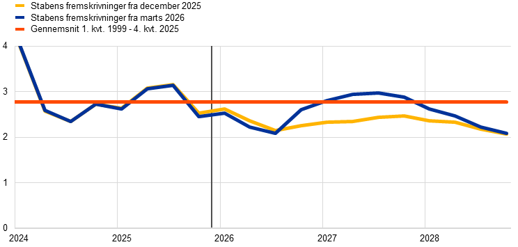 Økonomien i euroområdet voksede med 0,2 pct. ultimo 2025, hvilket var i overensstemmelse med stabens fremskrivninger fra december, og den blev understøttet af et stigende forbrug og øgede offentlige investeringer. De kortsigtede indikatorer tydede på en fortsat positiv vækstdynamik i de første to måneder af 2026, men krigen i Mellemøsten har medført en nedjustering af vækstudsigterne på kort sigt, da energiprisstødene og den øgede usikkerhed sandsynligvis vil føre til et mere afdæmpet forbrug og lavere investeringer. Betinget af et forholdsvis hurtigt fald i energipriserne, som fastsættes på futuresmarkederne for energiråvarer, samt af usikkerheden forventes denne nedgang at være midlertidig. På mellemlangt sigt ventes den indenlandske efterspørgsel fortsat at være den vigtigste drivkraft bag væksten i euroområdet, understøttet af et robust arbejdsmarked og offentlige udgifter til infrastruktur og forsvar, navnlig i Tyskland. Hvad angår forholdene uden for euroområdet, vil euroområdet, selvom eksportvæksten forventes at stige igen som følge af en stigende udenlandsk efterspørgsel, sandsynligvis opleve et fortsat tab af globale markedsandele på grund af vedvarende udfordringer for konkurrenceevnen, herunder udfordringer af strukturel karakter, og uanset at tolden på eksport til USA er noget lavere end på tidspunktet for decemberfremskrivningerne. I basisfremskrivningerne forudses en årlig vækst i realt BNP på 0,9 pct. i 2026, 1,3 pct. i 2027 og 1,4 pct. i 2028. Sammenlignet med fremskrivningerne fra december 2025 er væksten i BNP blevet nedjusteret med 0,3 procentpoint for 2026 og med 0,1 procentpoint i 2027 på grund af den eskalerende krig i Mellemøsten, mens den er uændret for 2028.