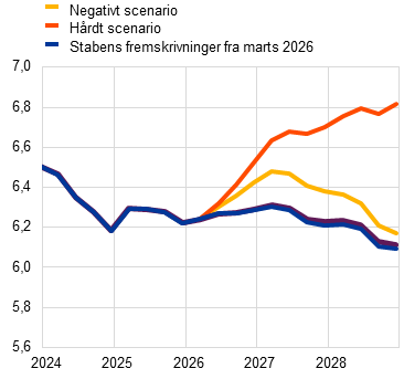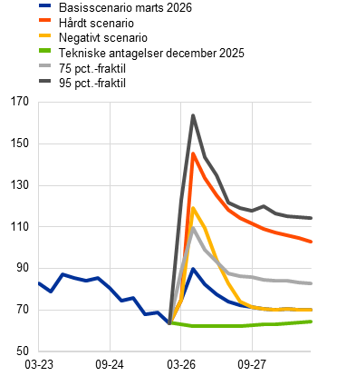 Endelig afspejler en række fremskrivninger baseret på tekniske antagelser med skæringsdato 4. marts (der omfatter informationer fra de første tre arbejdsdage efter krigens begyndelse i Mellemøsten) mere gunstige udsigter, hvor olie- og gaspriserne antages at toppe på henholdsvis 79 dollar pr. tønde og 48 euro pr. MWh i 2. Kvartal 2026[2]. I overensstemmelse med disse fremskrivninger vil inflationen ligge 0,3 procentpoint under det endelige basisscenario i 2026 og 0,1 procentpoint under det endelige basisscenario i 2027 og 2028, mens væksten vil være 0,1 procentpoint højere i hvert år i fremskrivningsperioden.