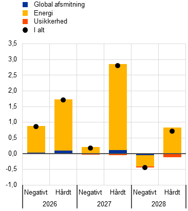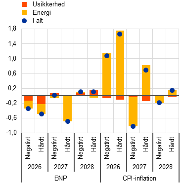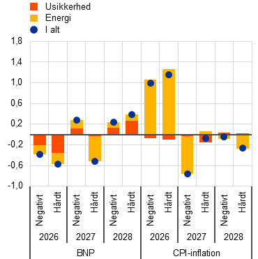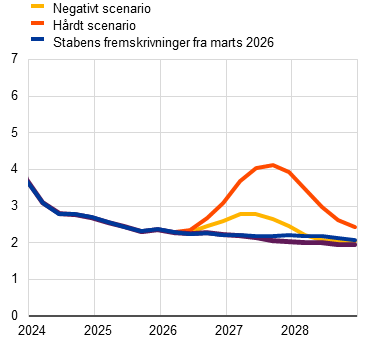 Ud over basisfremskrivningerne har staben udarbejdet alternative, hypotetiske scenarier, som afviger fra hinanden, når det gælder antagelserne om omfanget og varigheden af energiprisstødet, dets indvirkning på de internationale forhold og usikkerheden samt dets udbredelse via indirekte og anden runde-effekter på inflationen. Disse scenarier giver illustrative eksempler på alternative udviklingstendenser i råvarepriserne på energi og deres transmission til økonomien i euroområdet. Staben angiver ikke sandsynligheder for disse scenarier – de har snarere til formål at fremhæve de største usikkerheder med hensyn til konfliktens effekter. I overensstemmelse med den sædvanlige konvention i stabens fremskrivninger illustrerer disse scenarier effekterne på økonomien i euroområdet uden nogen penge- eller finanspolitisk reaktion, ud over hvad der er medtaget i basisscenariet. Det negative scenario omfatter kraftigere indirekte effekter og anden runde-effekter end basisscenariet med henblik på at opfange eventuelle ikke-lineariteter i udbredelsen af det oprindelige energiprisstød til andre priser i hele økonomien. Det forudsætter en meget kraftigere stigning i energipriserne samt en øget usikkerhed og negative internationale afsmitningseffekter (fx mindre udenlandsk efterspørgsel). Olie- og gaspriserne antages at toppe med henholdsvis 119 dollar pr. tønde og 87 euro pr. MWh i 2. kvartal 2026, før de nærmer sig basisantagelserne i 3. kvartal 2027. I forhold til basisscenariet indebærer det negative scenario, at inflationen vil være 0,9 procentpoint og 0,1 procentpoint højere i henholdsvis 2026 og 2027, men 0,5 procentpoint lavere i 2028 på grund af det disinflationære pres som følge af den hurtige normalisering af energipriserne i 2028. Omvendt vil den økonomiske vækst være lavere end i basisscenariet i 2026 og 2027, men højere i 2028. Sammenlignet med det negative scenario forudsætter det hårde scenario et kraftigere og mere vedvarende energiprisstød, større usikkerhed og endnu kraftigere indirekte effekter og anden runde-effekter. Oliepriserne antages at toppe på 145 dollar pr. tønde og gaspriserne på 106 euro pr. MWh i 2. kvartal 2026 for derefter at falde i et meget langsommere tempo og forblive betydeligt højere end antagelserne i både basisscenariet og det negative scenario i resten af fremskrivningsperioden. I forhold til basisscenariet vil den samlede inflation være betydeligt og vedvarende højere i fremskrivningsperioden (med 1,8 procentpoint i 2026, 2,8 procentpoint i 2027 og 0,7 procentpoint i 2028). Den betydelige forskel i inflationen i 2028 mellem det negative scenario (1,6 pct.) og det hårde scenario (2,8 pct.), som er vist i Tabel 1, fremhæver den centrale rolle, som konfliktens udvikling, afbrydelserne af energiforsyningen og størrelsen af de udbredningsmekanismer, der udløses af stødet, spiller i relation til at bestemme indvirkningen på inflationen på mellemlangt sigt. Den økonomiske vækst vil være 0,4-0,5 procentpoint lavere i 2026-2027, hvorefter den vil stige til 0,5 procentpoint over basisscenariet i 2028. Stigningen i væksten mod slutningen af fremskrivningsperioden afspejler antagelsen om en stigning i indkomst og efterspørgsel som følge af lønningernes opadrettede reaktion efter de foregående års inflationsstigning.