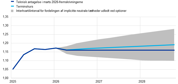 Skæringsdatoen for de tekniske antagelser fra 11. marts 2026 var to dage før færdiggørelsen af fremskrivningerne, hvilket er usædvanlig tæt på Styrelsesrådets pengepolitiske møde, den ekstraordinære geopolitiske udvikling og behovet for at medtage information om den hastigt skiftende situation taget i betragtning. Antagelserne er baseret på gennemsnittet af markedsdata over de tre dage frem til skæringsdatoen. Dette er et snævrere vindue end de ti dage, der normalt anvendes til stabens fremskrivninger, og det betyder, at kun data efter udbruddet af krigen i Mellemøsten er taget i betragtning. Fremskrivningerne for de internationale forhold blev afsluttet 11. marts 2026, og fremskrivningerne for euroområdet blev afsluttet 13. marts 2026. På grund af den begrænsede tid, der var til rådighed til at færdiggøre fremskrivningerne, var det ikke muligt at udarbejde visse af de variabler, der normalt rapporteres i fremskrivningerne.