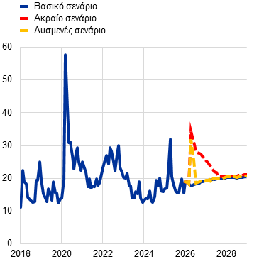 Πέρα από το βασικό σενάριο των προβολών, οι εμπειρογνώμονες κατάρτισαν εναλλακτικά σενάρια με διαφορετικές υποθέσεις σχετικά με το μέγεθος και την επιμονή της διαταραχής των τιμών της ενέργειας, τον αντίκτυπό της στο διεθνές περιβάλλον και την αβεβαιότητα, καθώς και τη διάδοσή της μέσω έμμεσων και δευτερογενών επιδράσεων στον πληθωρισμό. Αυτά τα σενάρια παρέχουν ενδεικτικά παραδείγματα για τις εναλλακτικές πορείες των τιμών των ενεργειακών αγαθών και τη μετάδοσή τους στην οικονομία της ζώνης του ευρώ. Οι εμπειρογνώμονες δεν αποδίδουν πιθανότητες σε αυτά τα σενάρια – αυτά χρησιμεύουν μάλλον για να επισημάνουν τις βασικές αβεβαιότητες που περιβάλλουν τις επιπτώσεις της σύγκρουσης. Όπως συμβαίνει συνήθως στις προβολές των εμπειρογνωμόνων, αυτά τα σενάρια δείχνουν τις επιπτώσεις στην οικονομία της ζώνης του ευρώ χωρίς τη λήψη μέτρων από την πλευρά της νομισματικής ή της δημοσιονομικής πολιτικής πέραν όσων περιλαμβάνονται στο βασικό σενάριο. Το δυσμενές σενάριο ενσωματώνει εντονότερες έμμεσες και δευτερογενείς επιδράσεις σε σχέση με το βασικό σενάριο, με σκοπό να αποτυπωθούν πιθανές μη γραμμικότητες στη διάδοση της αρχικής διαταραχής των τιμών της ενέργειας σε άλλες τιμές σε ολόκληρη την οικονομία. Υποθέτει μια πολύ πιο απότομη αύξηση των τιμών της ενέργειας, καθώς και αύξηση της αβεβαιότητας και των δυσμενών διεθνών επιδράσεων (π.χ. μείωση της εξωτερικής ζήτησης). Οι τιμές του πετρελαίου και του φυσικού αερίου αναμένεται, βάσει των υποθέσεων, να κορυφωθούν σε 119 δολάρια ΗΠΑ ανά βαρέλι και σε 87 ευρώ ανά MWh αντίστοιχα το β΄ τρίμηνο του 2026 και στη συνέχεια να συγκλίνουν προς τις υποθέσεις του βασικού σεναρίου μέχρι το γ΄ τρίμηνο του 2027. Σε σχέση με το βασικό σενάριο, το δυσμενές σενάριο υποδηλώνει ότι ο πληθωρισμός θα είναι υψηλότερος κατά 0,9 ποσ. μον. και κατά 0,1 ποσ. μον. το 2026 και το 2027 αντίστοιχα, αλλά χαμηλότερος κατά 0,5 ποσ. μον. το 2028 λόγω των αντιπληθωριστικών πιέσεων που θα απορρέουν από την ταχεία ομαλοποίηση των τιμών της ενέργειας το εν λόγω έτος. Αντιθέτως, ο ρυθμός οικονομικής ανάπτυξης θα είναι χαμηλότερος σε σχέση με το βασικό σενάριο το 2026 και το 2027, αλλά υψηλότερος το 2028. Σε σύγκριση με το δυσμενές σενάριο, το ακραίο σενάριο υποθέτει εντονότερη και πιο επίμονη διαταραχή στις τιμές της ενέργειας, μεγαλύτερη αβεβαιότητα και ακόμη πιο έντονες έμμεσες και δευτερογενείς επιδράσεις. Οι τιμές του πετρελαίου αναμένεται, βάσει των υποθέσεων, να κορυφωθούν σε 145 δολάρια ΗΠΑ ανά βαρέλι και οι τιμές του φυσικού αερίου σε 106 ευρώ ανά MWh το β΄ τρίμηνο του 2026, στη συνέχεια να μειωθούν με πολύ βραδύτερο ρυθμό και να παραμείνουν σε επίπεδο σημαντικά υψηλότερο σε σχέση με τις υποθέσεις τόσο του βασικού όσο και του δυσμενούς σεναρίου κατά το υπόλοιπο του χρονικού ορίζοντα προβολής. Σε σχέση με το βασικό σενάριο, ο γενικός πληθωρισμός θα είναι σημαντικά και επίμονα υψηλότερος στη διάρκεια του χρονικού ορίζοντα προβολής (κατά 1,8 ποσ. μον. το 2026, 2,8 ποσ. μον. το 2027 και 0,7 ποσ. μον. το 2028). Η σημαντική διαφορά των ρυθμών πληθωρισμού το 2028 μεταξύ του δυσμενούς σεναρίου (1,6%) και του ακραίου σεναρίου (2,8%), όπως φαίνεται στον Πίνακα 1, αναδεικνύει τον βασικό ρόλο που διαδραματίζει η εξέλιξη της σύγκρουσης, οι διαταράξεις στον ενεργειακό εφοδιασμό και το μέγεθος των μηχανισμών μετάδοσης των επιδράσεων από τη διαταραχή για τον προσδιορισμό της επίδρ
