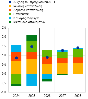Μεσοπρόθεσμα, ο ετήσιος ρυθμός αύξησης του πραγματικού ΑΕΠ αναμένεται, βάσει των προβολών, να επιταχυνθεί από 0,9% το 2026 σε 1,3% το 2027 και 1,4 % το 2028, καθώς η εγχώρια ζήτηση θα ανακάμπτει, σύμφωνα με την υποκείμενη υπόθεση που περιέχεται στα συμβόλαια μελλοντικής εκπλήρωσης επί των τιμών της ενέργειας για βραχύβια διαταραχή, και η αρνητική συμβολή των καθαρών εξαγωγών θα γίνεται οριακά θετική το 2027 (Διάγραμμα 2 και Πίνακας 2). Η υποχώρηση του ετήσιου ρυθμού αύξησης το 2026 σε 0,9% από 1,5% το 2025 αντανακλά τόσο τη χαμηλότερη δυναμική εντός του έτους όσο και τη μικρότερη μεταφερόμενη επίδραση. Από την πλευρά των δαπανών, η ιδιωτική κατανάλωση προβλέπεται να παραμείνει ο σημαντικότερος προωθητικός παράγοντας της ανάπτυξης, σε συνδυασμό με την έντονη δυναμική των επενδύσεων.