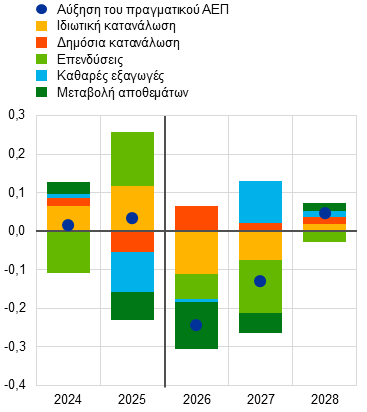 • Η αύξηση των εξαγωγών αναμένεται να παραμείνει υποτονική, καθώς οι επίμονες προκλήσεις ανταγωνιστικότητας της ζώνης του ευρώ, οι δασμοί των ΗΠΑ και η προηγούμενη ανατίμηση του ευρώ εξακολουθούν να επηρεάζουν αρνητικά τις εξαγωγικές επιδόσεις. Ο πόλεμος στη Μέση Ανατολή αναμένεται να έχει σχετικά ήπιο αντίκτυπο στην αύξηση των εξαγωγών, οι οποίες βραχυπρόθεσμα αναμένεται να ωφεληθούν από τις κάπως καλύτερες πρόσφατες οικονομικές επιδόσεις των κυριότερων εμπορικών εταίρων, καθώς και από μια μέτρια ώθηση από τους χαμηλότερους δασμούς (βλ. Πλαίσιο 1). Παρ’ όλα αυτά, το εξαγωγικό μερίδιο της ζώνης του ευρώ αναμένεται να μειωθεί περαιτέρω. Συνολικά, οι καθαρές εξαγωγές είναι πιθανόν να έχουν μικρή αρνητική συμβολή στον ρυθμό αύξησης του πραγματικού ΑΕΠ το 2026 και στη συνέχεια θα γίνουν οριακά θετικές το 2027 και σε γενικές γραμμές ουδέτερες το 2028.