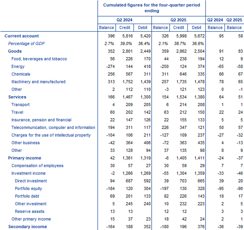 The current account of the euro area recorded a surplus of €326 billion (2.1% of euro area GDP) in the four quarters to the second quarter of 2025, following a €396 billion surplus (2.7% of GDP) a year earlier (Table 1). This decrease was mainly driven by a shift in the balance for primary income from a surplus (€42 billion) to a deficit (€6 billion) and, to a lesser extent, by a wider deficit for secondary income (from €164 billion to €180 billion) as well as a lower surplus for services (from €166 billion to €154 billion). These developments were partly offset by a larger surplus for goods (from €352 billion to €359 billion).