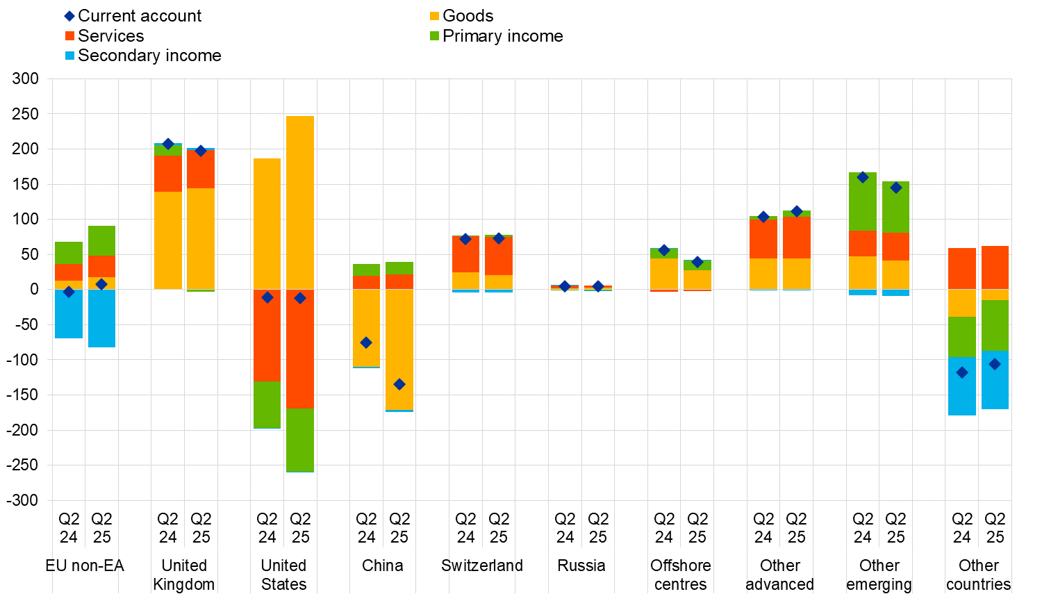 The most significant changes in the current account components by geographical counterpart over the four quarters ending in the second quarter of 2025 relative to the previous year were as follows: in goods, the surplus vis-à-vis the United States increased from €186 billion to €247 billion, while the deficit vis-à-vis China widened from €110 billion to €172 billion. In services, the deficit vis-à-vis the United States increased from €131 billion to €169 billion, while the surplus vis-à-vis EU Member States and EU institutions outside the euro area increased from €23 billion to €31 billion. In primary income, the deficit vis-à-vis the United States increased from €66 billion to €90 billion, while in secondary income the deficit vis-à-vis EU Member States and EU institutions outside the euro area increased from €70 billion to €82 billion.