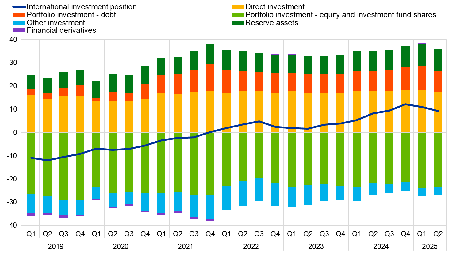 At the end of the second quarter of 2025, the international investment position of the euro area recorded net assets of €1.43 trillion vis-à-vis the rest of the world (9.3% of euro area GDP), down from €1.69 trillion in the previous quarter (Chart 2 and Table 2).